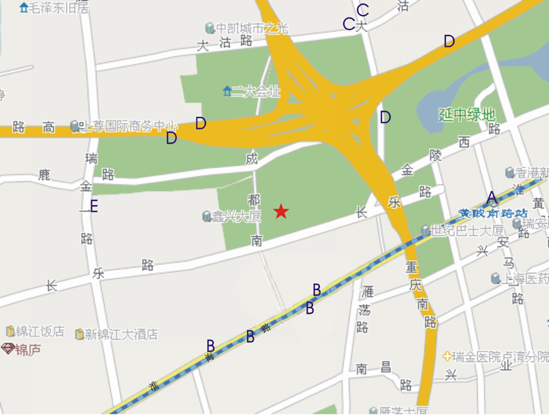 交通路线: A:地铁—黄坡南路站 B:淮海路—42、926、911、945、167 C:重庆路—36、253、839、933、952B、974 D:延安中路—01、127、71、925、48、780、775 E:瑞金路—24、41、104、128、301、304、955